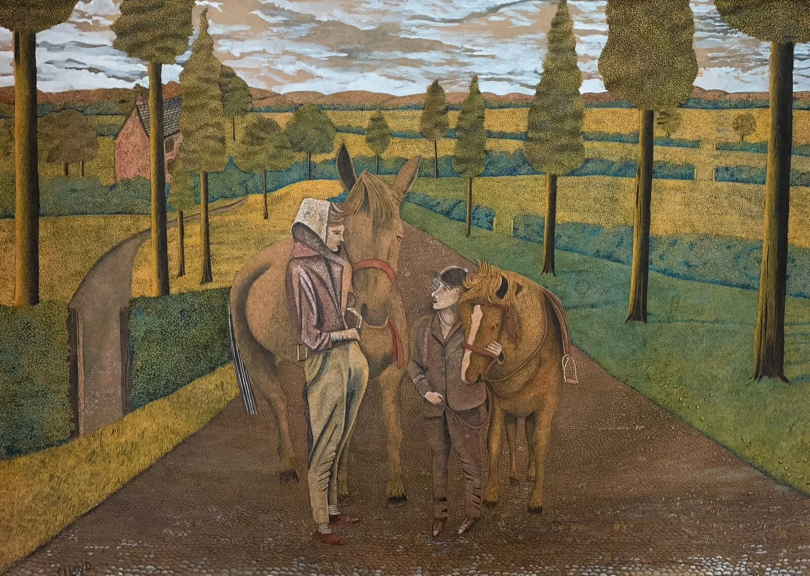 James Lloyd was born into a farming family in Cheshire England in 1905. A remarkable man of great warmth, James Lloyd had an acute sense of observation. Before he became famous as a painter, he earned his living at a variety of jobs, such as a builder’s laborer, a lamp lighter, a stoker, a bus conductor, a policeman, and lastly, a farm laborer. He also distinguished himself during World War II as a member of the Coldstream Guards. His pointillist painting style developed from his desire to copy reproductions of works by great English artists such as Constable and Turner. While carefully studying color illustrations of these works in various books and journals, he discovered that the reproductions consisted of thousands of tiny dots, and he set about painstakingly copying this photographic process, dot by dot, using old paintbrushes with just a few hairs each. His subject matter was wide-ranging and included erotic scenes, farm animals, and local events. To amuse his children, he also painted pop singers and film stars. Lloyd once remarked that he found it difficult to paint unless his wife, Nancy, and his 9 children were all at home around him making noise. He was obsessive about his paintings, spending many hours on each one. In the mid-1960s, his reputation and fame spread and his paintings were featured in many important collections. - from Self-taught and Outsider Art by the Anthony Petullo Collection